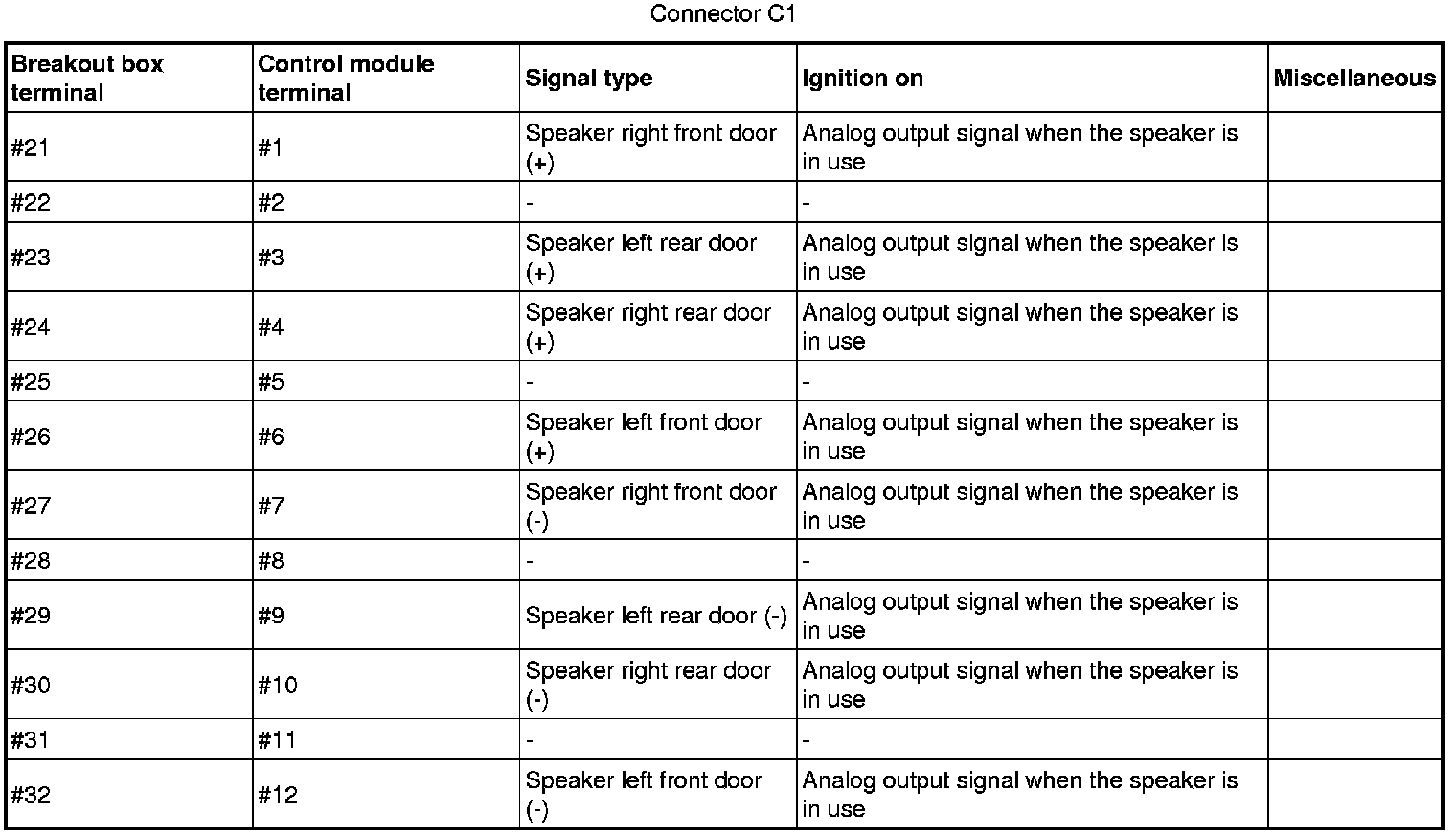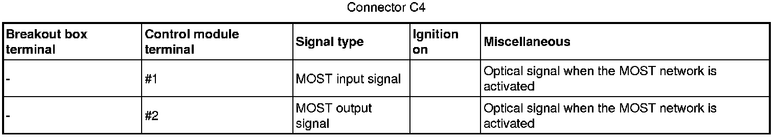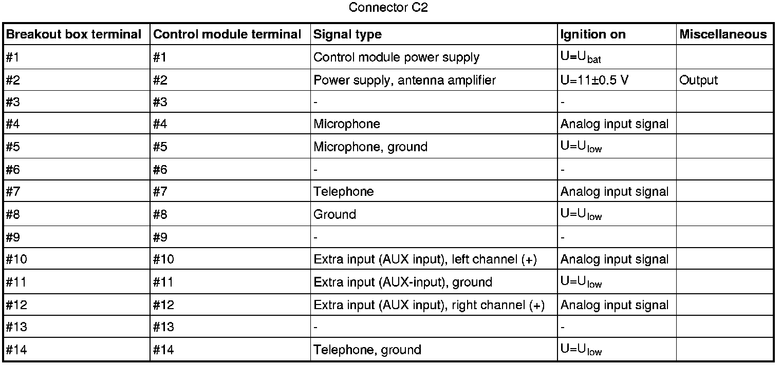 Signal description, Integrated Audio Module (IAM)GeneralAll values below are measured between the relevant terminal in column 1 and C2-8 in column 2 (power ground) unless otherwise stated in parenthesis after the table entry.
