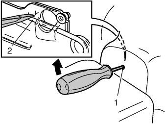- Pry the screwdriver upwards towards the upper edge of the hole (1) so that the end of the screwdriver presses the spring clip down (2) until one side of the steering wheel module springs out and releases from the mounting.