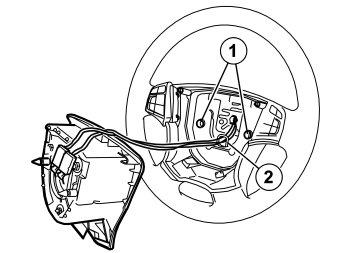 - Insert a screwdriver in the hole (1) on the reverse of the steering wheel, at right angles to the rear surface of the steering wheel. Insert the screwdriver as far as possible to determine the position of the end of the spring clip (2).
