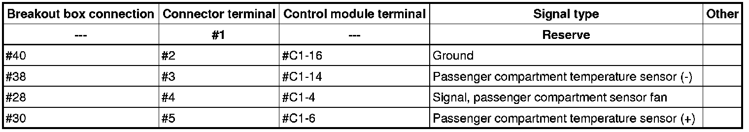 Passenger compartment temperature sensor: Resistance between terminals #30 and #38 on the breakout box should be approx. 11.99 kohms at +20 °C. Resistance decreases as temperature increases.