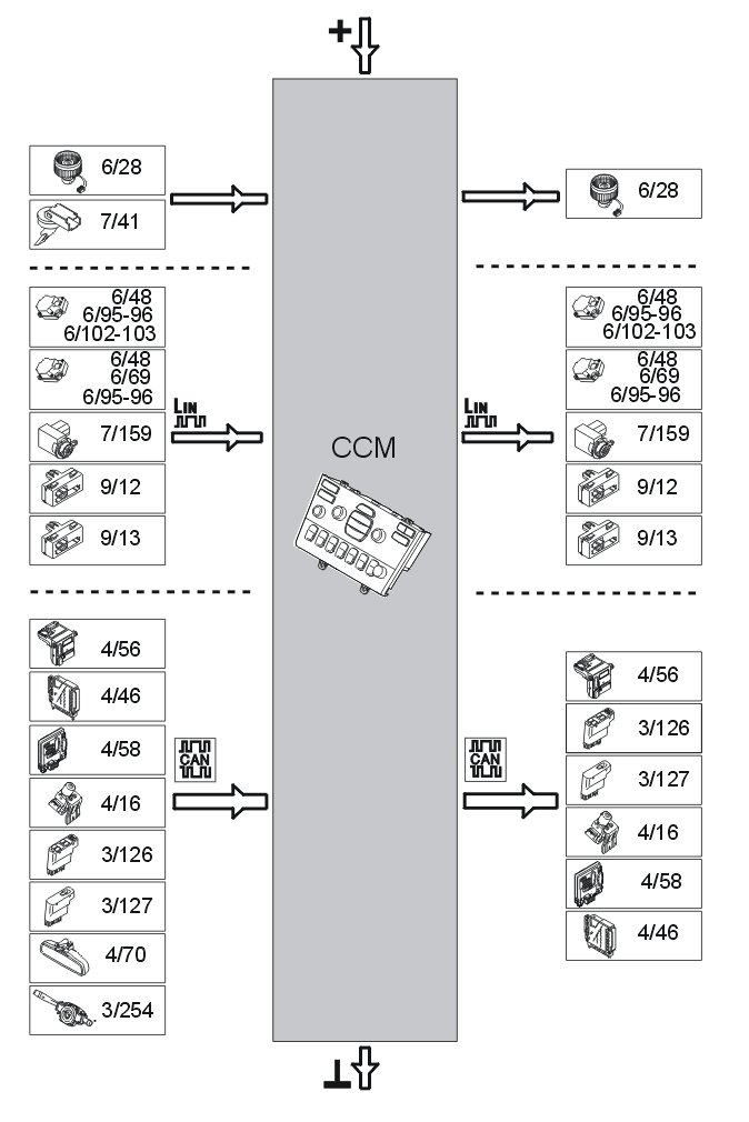 The number of components on the LIN buses varies, depending on the equipment level of the car (ECC/MCC and any accessories) and whether the car is