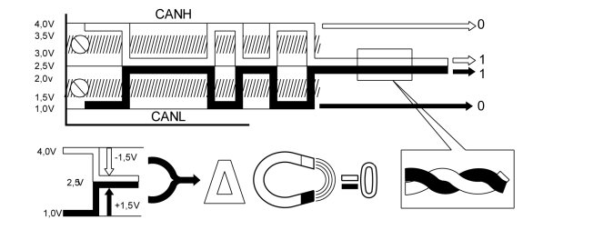 - Binary 0 = 4 V on CAN H and 1 V on CAN L.