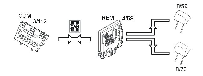 The rear head restraints fold down when the switch on the climate control module (CCM) (3/112) is pressed. The climate control module (CCM) transmits a request via the Controller area network (CAN) to the rear electronic module (REM) (4/58) to activate the function. The rear electronic module (REM) activates the relay. The solenoids (8/59-60) in the head restraints are then powered by the relay.
