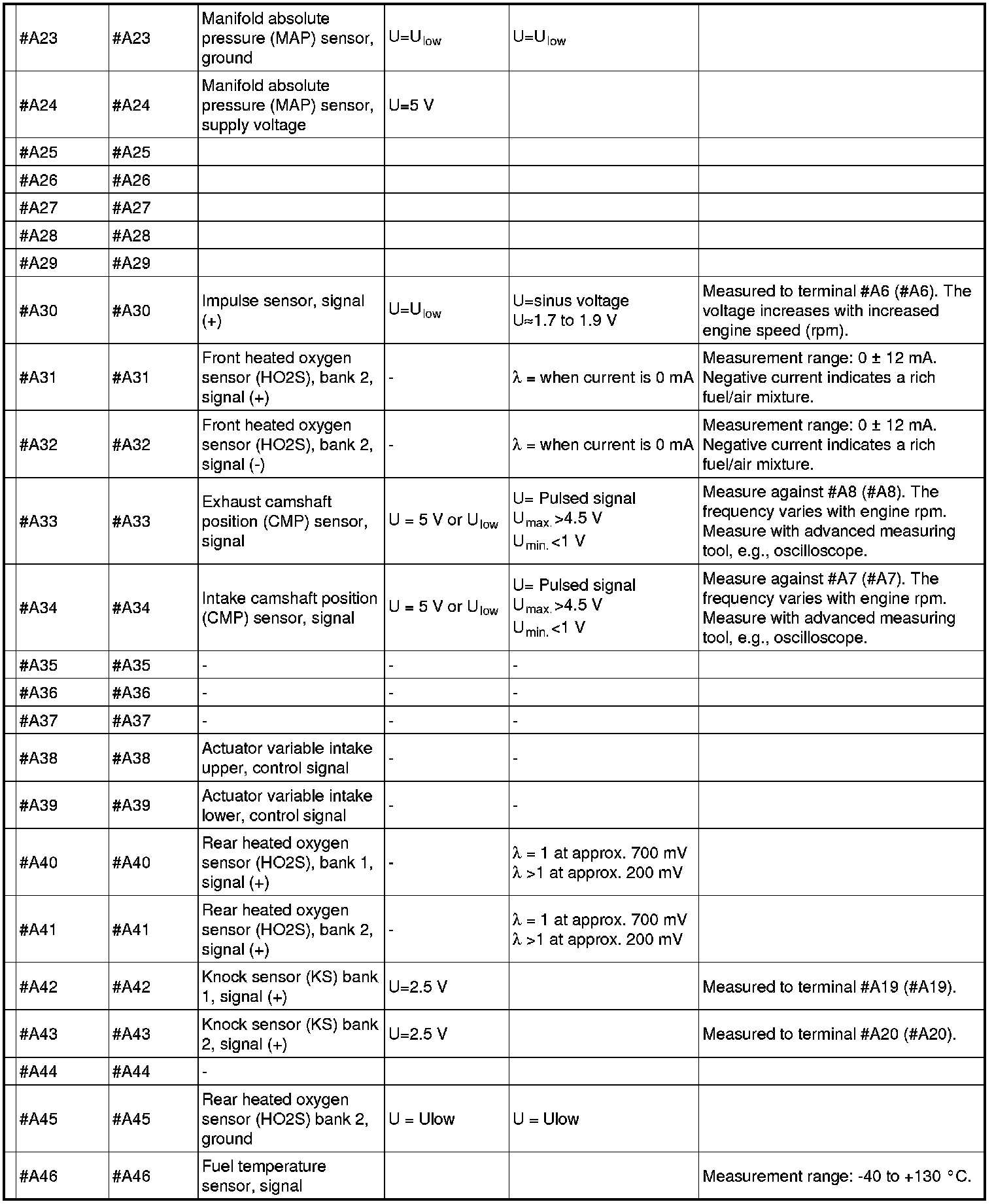 All values indicated below are between respective connection in column 1 and #A C2 on the breakout box. If this is not the case, it is indicated within brackets.