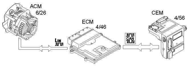 The engine control module (ECM) (4/46) regulates the charge voltage of the alternator (GEN) (6/26) (via LIN communication) when requested by the central electronic module (CEM) (4/56) (via CAN communication).