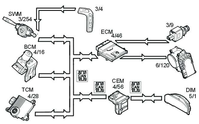The driver activates the function by pressing the SET+ or SET- button. A message is then transmitted via the low speed side of the CAN network to the central electronic module (CEM) which then transmits the message on via the high speed side of the CAN network to the engine control module (ECM).