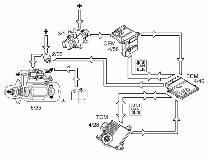 The starter motor (6/25) is supplied with power via the starter motor relay (2/35), the starter motor relay is controlled by the engine control module (ECM) (4/46).