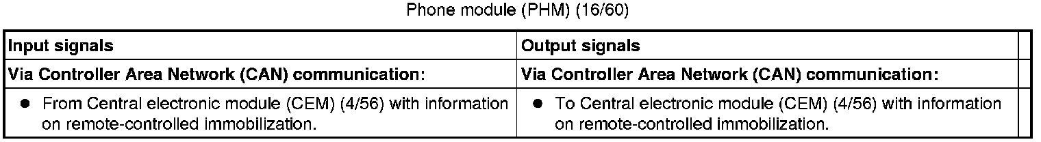 The tables below summarize the input and output signals to the units in the system for the immobilizer. The signal types are divided into directly connected signals, serial communication and controller area network (CAN) communication.