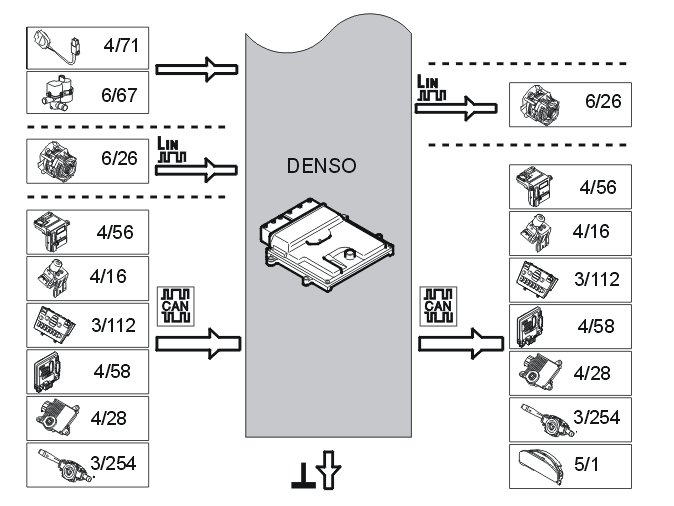 The table below summarizes the input signals to and output signals from the Engine Control Module (ECM). The signal types are divided into directly connected signals, LIN and controller area network (CAN) communication. The illustration below displays the same information with the Volvo component designations.