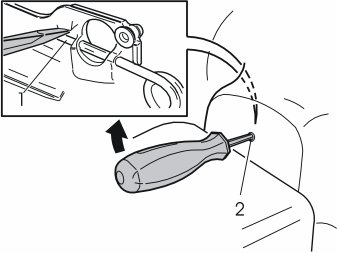 - Pry the screwdriver upwards towards the upper edge of the hole (2) so that the end of the screwdriver presses the spring clip down (1) until one side of the steering wheel module springs out and releases from the mounting.