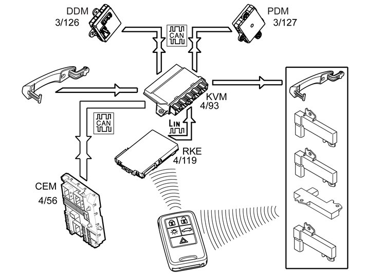When an unlock sensor is activated in one of the door handles, the keyless vehicle module (KVM) activates the antennas in the handle on the rear doors on the side on which the unlock sensor handle was activated. An encrypted request is transmitted via the antenna to the passive remote key. The remote key transmits an encrypted response which is received by the remote keyless entry (RKE) receiver. The remote keyless entry (RKE) receiver checks that the received signal is from a Volvo remote key. If it is, the message is forwarded to the keyless vehicle module (KVM). The keyless vehicle module (KVM) decrypts the signal and compares the received code from the remote key with its own Programd codes. If these correspond, the keyless vehicle module (KVM) transmits two CAN-signals. One signal is sent to the relevant door module for unlock request of the relevant door. The other signal is transmitted to the central electronic module (CEM) which unlocks the other doors, depending on the system settings. The settings are: