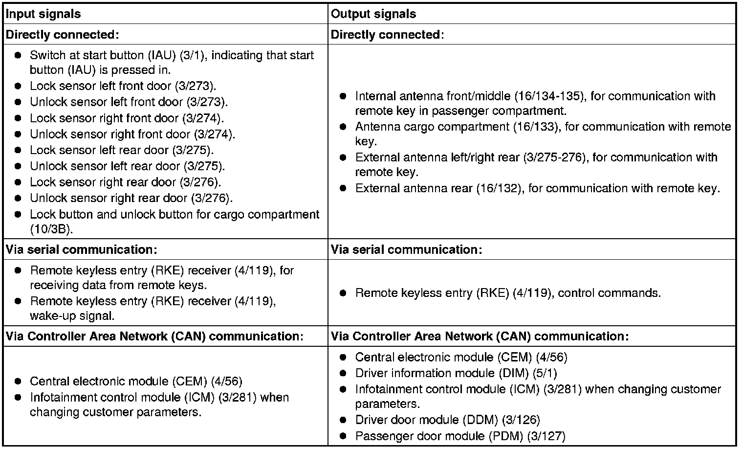 The table below summarizes the input signals to and output signals from the keyless vehicle module (KVM). The signal types are divided into directly connected signals, serial communication and controller area network (CAN) communication. The illustration below displays the same information with the Volvo component designations.