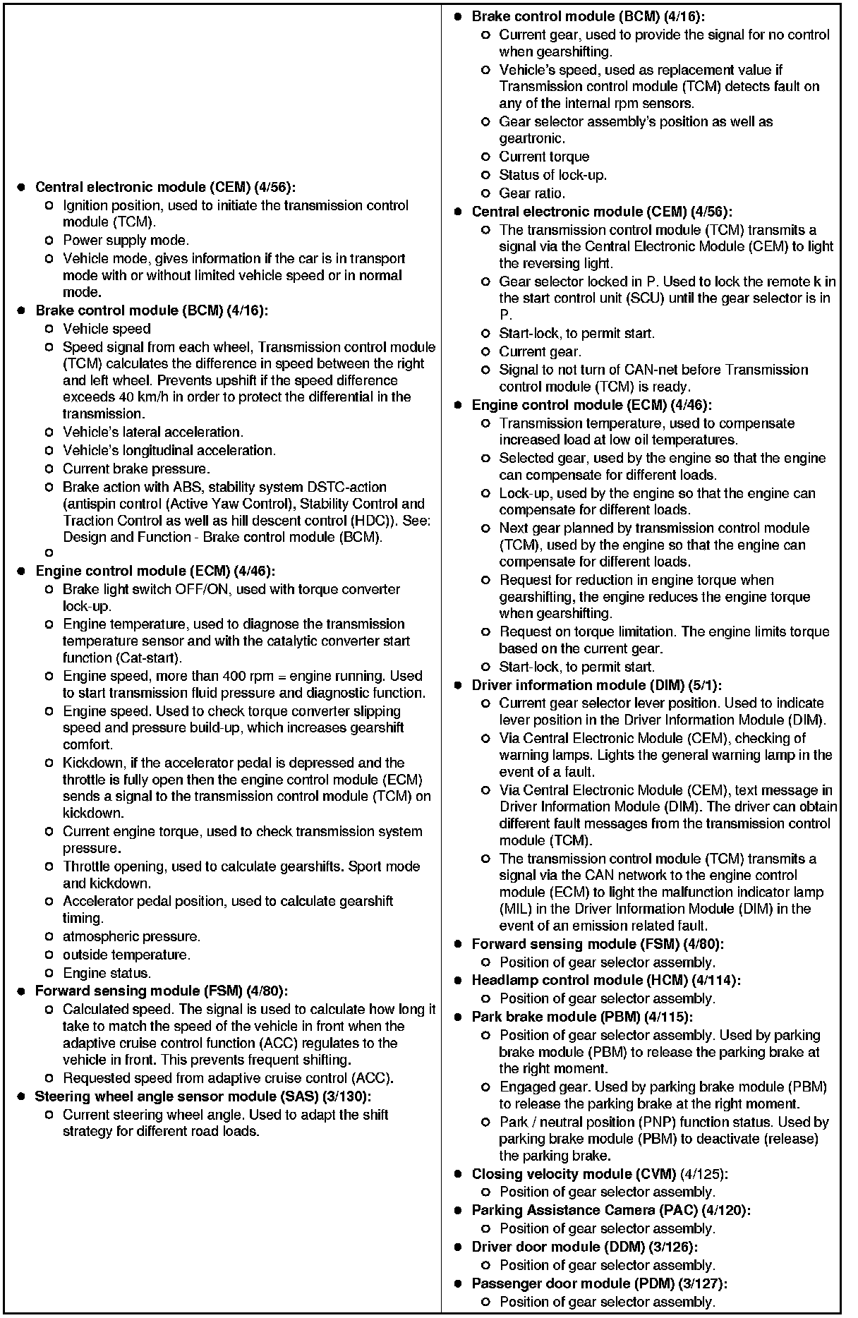 - Gear selector module (GSM) - Provides transmission control module (TCM)information such as Geartronic mode.