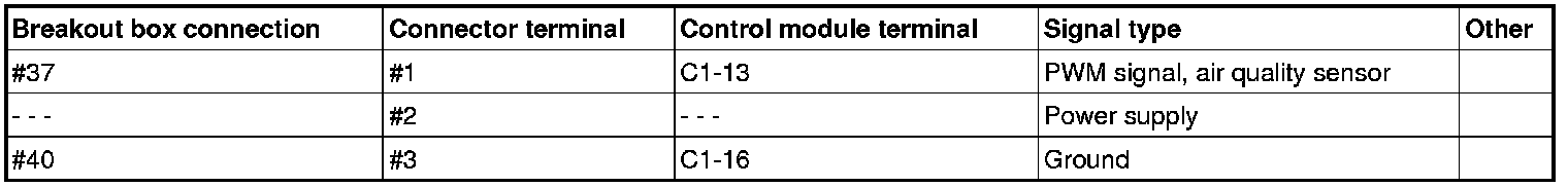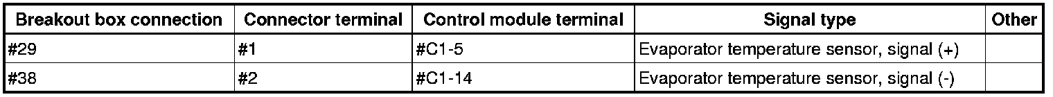 Passenger compartment temperature sensor: Resistance between terminals #30 and #38 on the breakout box should be approx. 11.99 kohms at +20 °C. Resistance decreases as temperature increases.