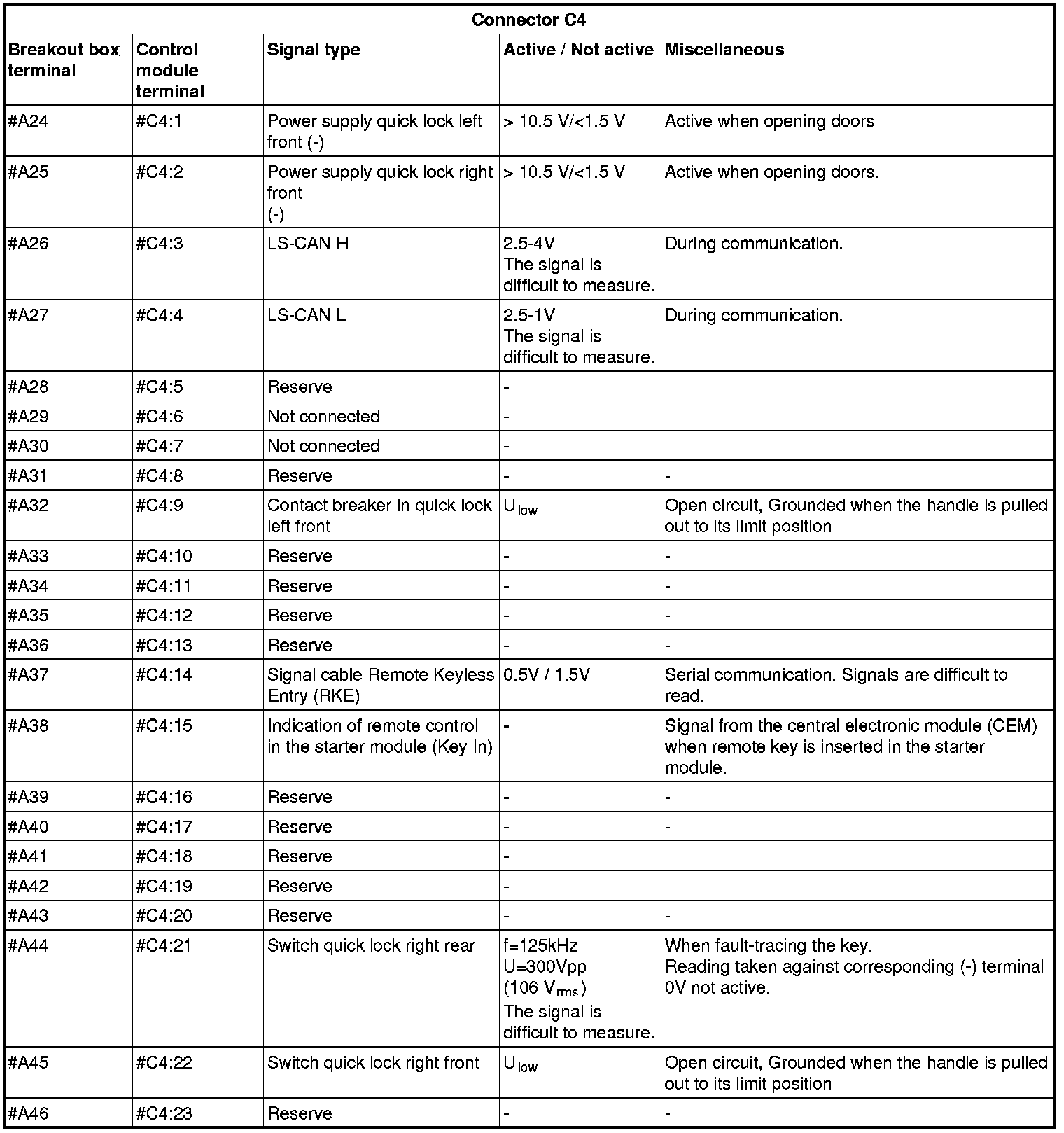 All values given below are between the terminals stated in column 1 and terminal #B4 (power ground). This applies unless otherwise indicated in brackets.