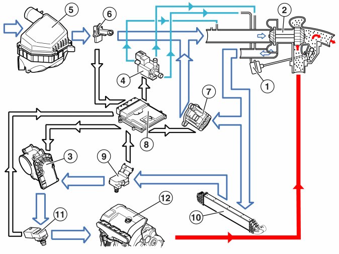 The Engine Control Module (ECM) (8) receives information about the current throttle position via the throttle position sensor for the throttle unit (3), engine load, knocking, etc. This affects the boost pressure that is permitted. The boost pressure is measured by the boost pressure sensor (9).