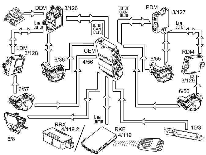 Note! The market in Japan has Remote Keyless Entry (RKE) regardless of if the vehicle is equipped with keyless entry system or not. When the vehicle is not equipped with keyless entry system, the Remote Keyless Entry (RKE) communicates directly with Central electronic module (CEM).