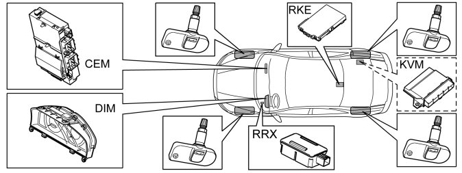 The function is integrated in the central electronic module (CEM). Sensors are installed together with the air valve on each wheel to measure the air pressure in the tires.