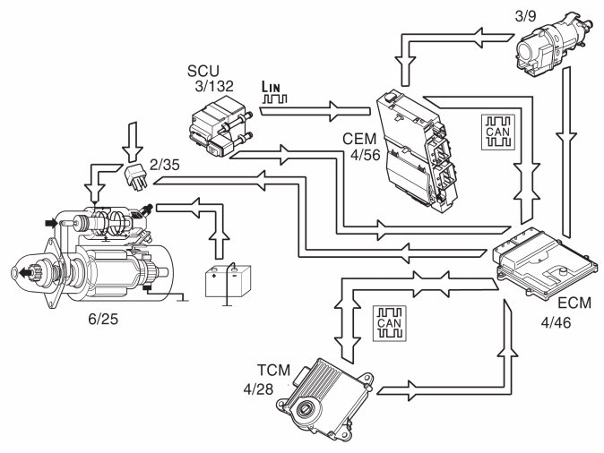 3. The central electronic module (CEM) (4/56) uses the button signal together with the signal from the brake light switch (3/9) and creates a start request that is transmitted to the engine control module (ECM) via CAN communication.