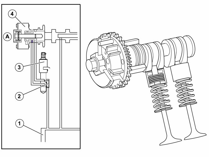 The engine control module (ECM) detects the position of the camshafts by comparing the signals from the engine speed (rpm) sensor (1) (crankshaft position) and the camshaft position (CMP) sensors (2) (camshaft positions). The engine control module (ECM) then controls the angle of the camshaft by controlling the oil flow to the CVVT unit using the reset valve camshaft (3).