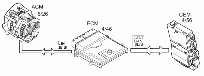The engine control module (ECM) (4/46) regulates the charge voltage of the alternator (GEN) (6/26) (via LIN communication) when requested by the central electronic module (CEM) (4/56) (via CAN communication).