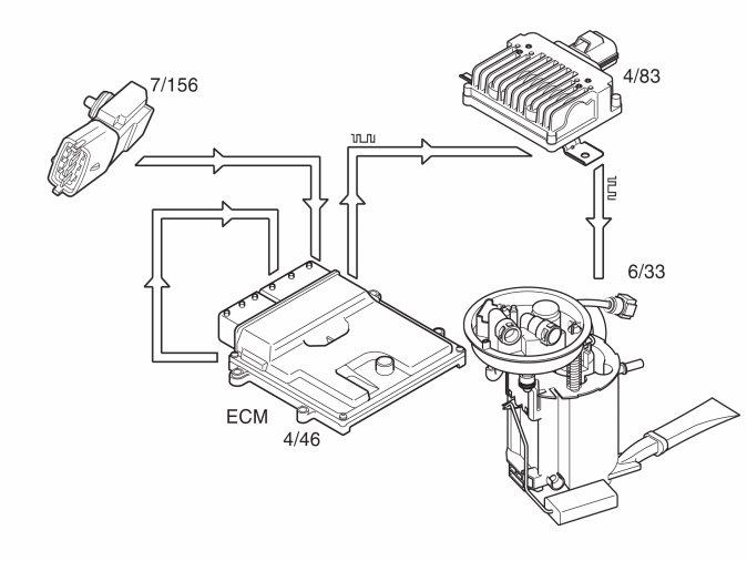 The engine control module (ECM) calculates the desired fuel pressure. A signal is then transmitted to the fuel pump control module indicating the desired fuel pressure. Serial communication between the engine control module (ECM) and the fuel pump control module is used to carry the signal. The fuel pump control module then operates the fuel pump unit to obtain the desired pressure using a pulse width modulation (PWM) voltage on the ground lead. The fuel pump (FP) can be controlled steplessly by changing the pulse ratio of the pulse width modulation (PWM) signal. Only that pressure which is required at that specific time will then be released to the fuel rail/injectors. The value of the pulse width modulation (PWM) signal is a measurement of the operational load of the fuel pump (FP) (% duty, 100% = maximum pressure).