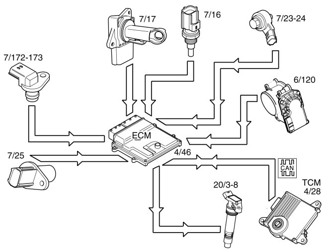 The mechanical stress generated in the knock sensors' piezo-electric materials result in generation of a voltage. The Engine control module (ECM) (4/46) can then, using the camshaft sensors (7/172-173) and the impulse sensor (7/25), decide which cylinder is knocking.