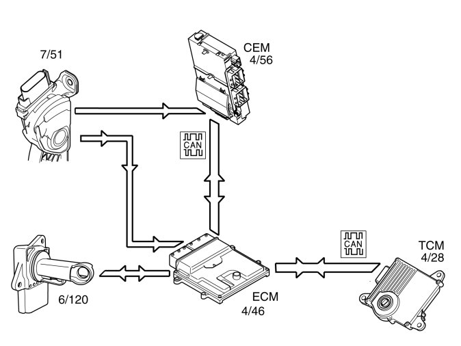 To ensure that the correct throttle angle is reached, the engine control module (ECM) (4/46) controls the throttle shutter in the throttle unit (6/120), mainly using the signal from: