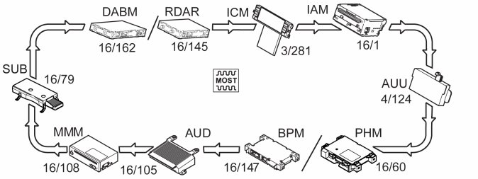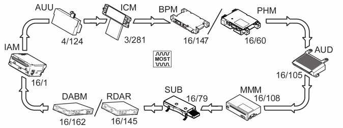All messages within the MOST-net pass in one and the same direction from Infotainment Control Module (ICM) to Accessory USB Unit (AUU) (applies to S80/V70/XC70) respective Remote digital audio receiver (RDAR)/Digital Audio Broadcast Module (DABM) (applies to XC60).