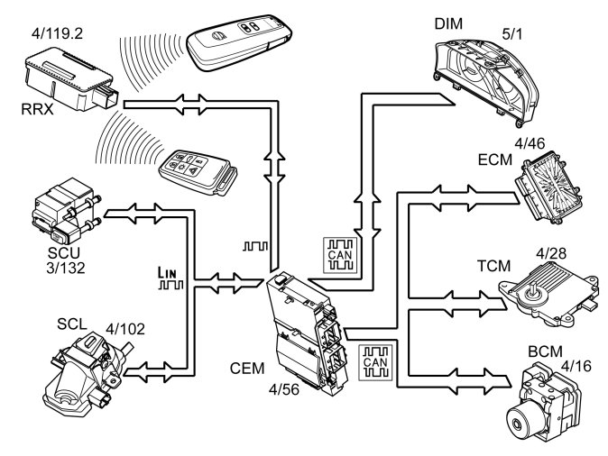 The vehicle cannot be started until the lock bolt in Steering column lock module (SCL) is in unlocked position. The lock bolt's position is indicated by a switch located in Steering column lock module (SCL) and is connected to Central electronic module (CEM).