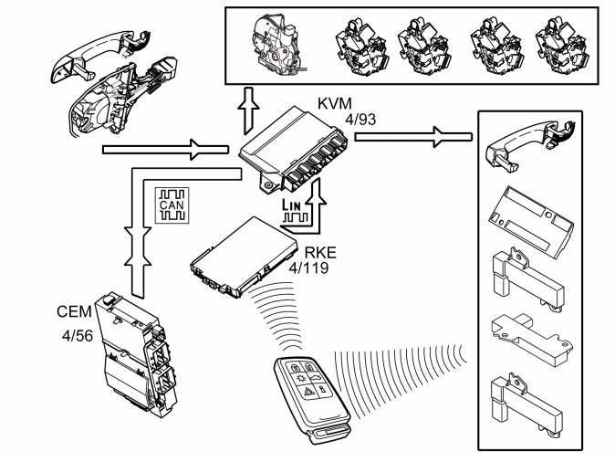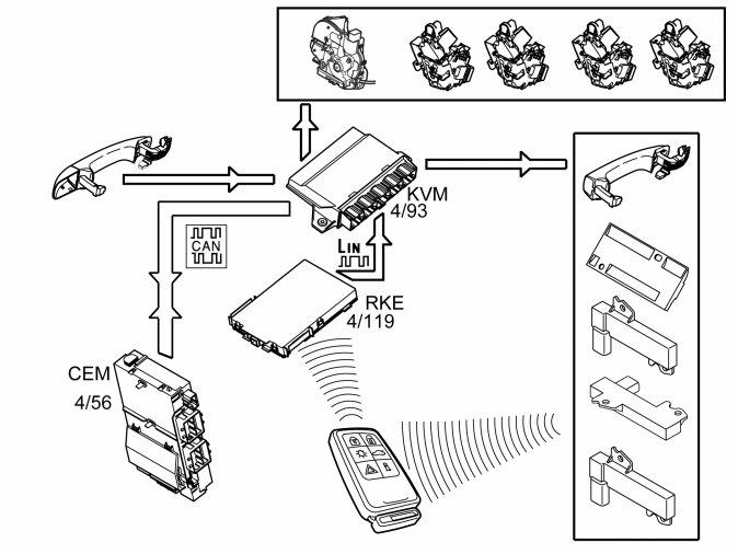 When the contact breaker in the handle is closed, the keyless vehicle module (KVM) activates the antennas in the handle on the rear doors on the side on which the handle was pulled out. A request is transmitted via the antenna to the passive remote key. The remote key transmits an encrypted response which is received by the remote keyless entry (RKE) receiver. The remote keyless entry (RKE) receiver checks that the received signal is from a Volvo remote key. If it is, the message is forwarded to the keyless vehicle module (KVM). The keyless vehicle module (KVM) decrypts the signal and compares the received code from the remote key with its own programmed codes. If these correspond, the keyless vehicle module (KVM) transmits two signals. One signal is transmitted to the quick lock, in the door on which the handle was pulled out, to unlock and open the door. The other signal is transmitted to the central electronic module (CEM) which unlocks the other doors, depending on the system settings. The settings are: