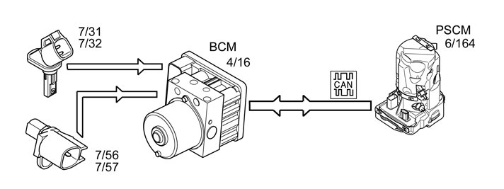 While driving, the brake control module (BCM) (4/16) registers the acceleration and deceleration of the wheels. The 4 wheel sensors (7/31-32 and 7/56-57) (one on each wheel) provide the brake control module (BCM) with information about the rotation speed of each wheel. The brake control module (BCM) calculates the actual speed of the car using this information and puts it out on the controller area network (CAN). The vehicle speed signal is used by the Power Steering Control Module (PSCM) (6/164) so that, when combined with other parameters, it can calculate the optimal desired value for the pump motor speed. The system reduces the speed of the pump motor (=reduced hydraulic pressure) when the vehicle speed increases. The pump motor speed increases (=increased hydraulic pressure) as vehicle speed drops. This to obtain optimal steering assistance in relation to vehicle speed. This is speed dependent power steering.