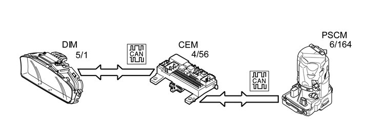 If a fault is registered (certain diagnostic trouble codes (DTCs) only), the Power Steering Control Module (PSCM) (6/164) will inform the central electronic module (CEM) (4/56) that there is a fault in the power steering system via the controller area network (CAN). The central electronic module (CEM) then transmits a request via the controller area network (CAN) to the driver information module (DIM) (5/1) to light the information lamp and to activate a text message in the display. The text message informs the driver that there is a fault in the power steering system. When the fault has been remedied, a request is transmitted in the same way to switch off the information lamp and deactivate the text message.