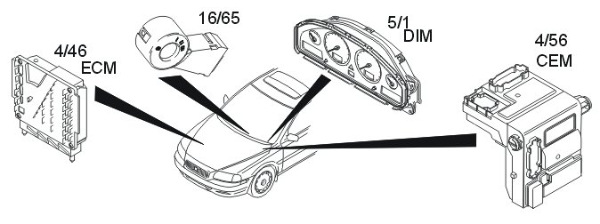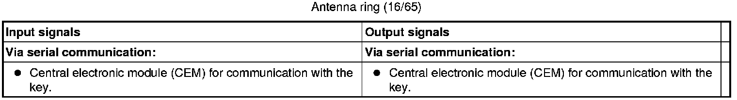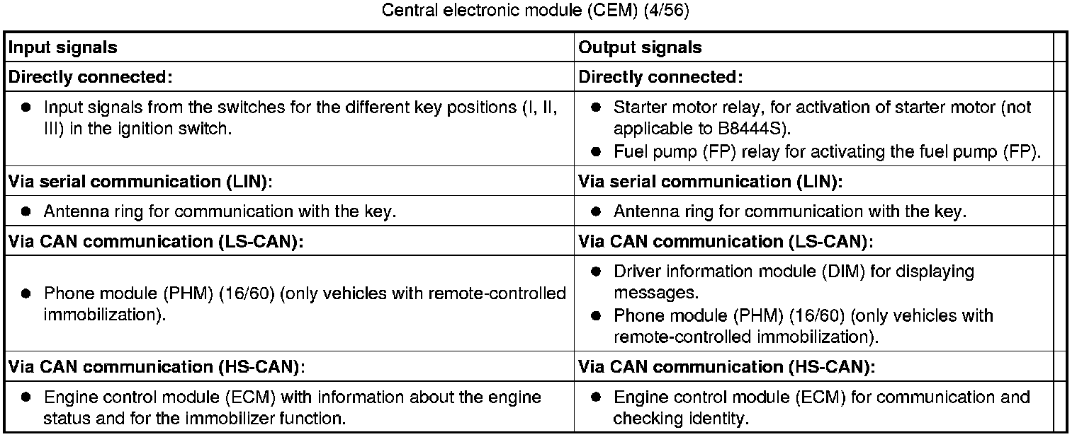 The tables below summarize the input and output signals to the units in the system for the immobilizer. The signal types are divided into directly connected signals, serial communication and controller area network (CAN) communication.
