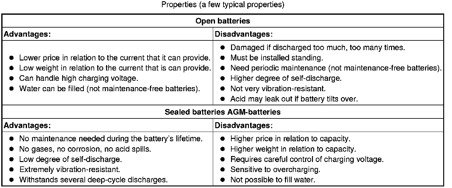 Gel batteries have good capacity, but due to the slightly higher resistance in the low viscosity acid, they may be limited as start batteries. They can handle deep cycle discharges very well, that is, when you slowly discharge the batteries a lot several times.