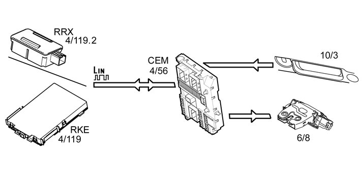 Note! The market in Japan has Remote Keyless Entry (RKE) regardless of if the vehicle is equipped with keyless entry system or not. When the vehicle is not equipped with keyless entry system, the Remote Keyless Entry (RKE) communicates directly with Central electronic module (CEM).