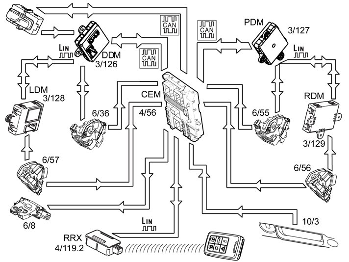 Note! The market in Japan has Remote Keyless Entry (RKE) regardless of if the vehicle is equipped with keyless entry system or not. When the vehicle is not equipped with keyless entry system, the Remote Keyless Entry (RKE) communicates directly with Central electronic module (CEM). If the vehicle is equipped with keyless entry system, the Remote Keyless Entry (RKE) communicates via Keyless Vehicle Module (KVM).