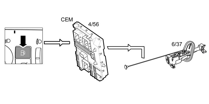 The switch for opening the fuel tank filler cover is in the light switch module (LSM). The light switch module (LSM) is serially connected, via LIN, to the central electronic module (CEM) and transmits a signal to the central electronic module (CEM) when the switch is pressed. The lock motor is directly connected to the central electronic module (CEM).