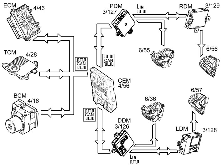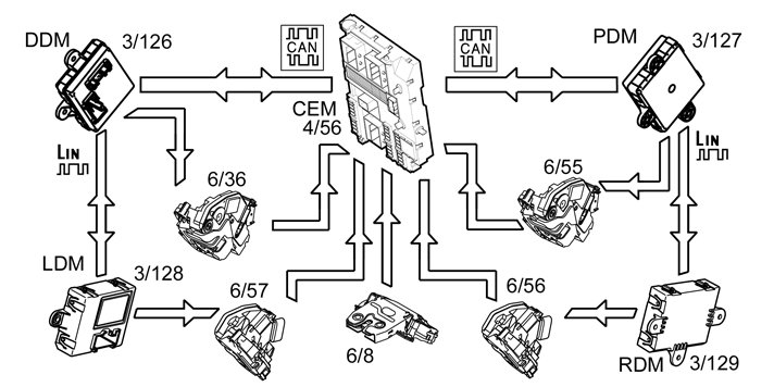 The vehicle is locked using the lock sensors on the door handles or with lock button on the tailgate. During locking, the antenna is also activated to check that there is an authorized remote key in the vicinity of the vehicle. If the remote key is approved, the keyless vehicle module (KVM) transmits a signal to the central electronic module (CEM) to lock the vehicle.