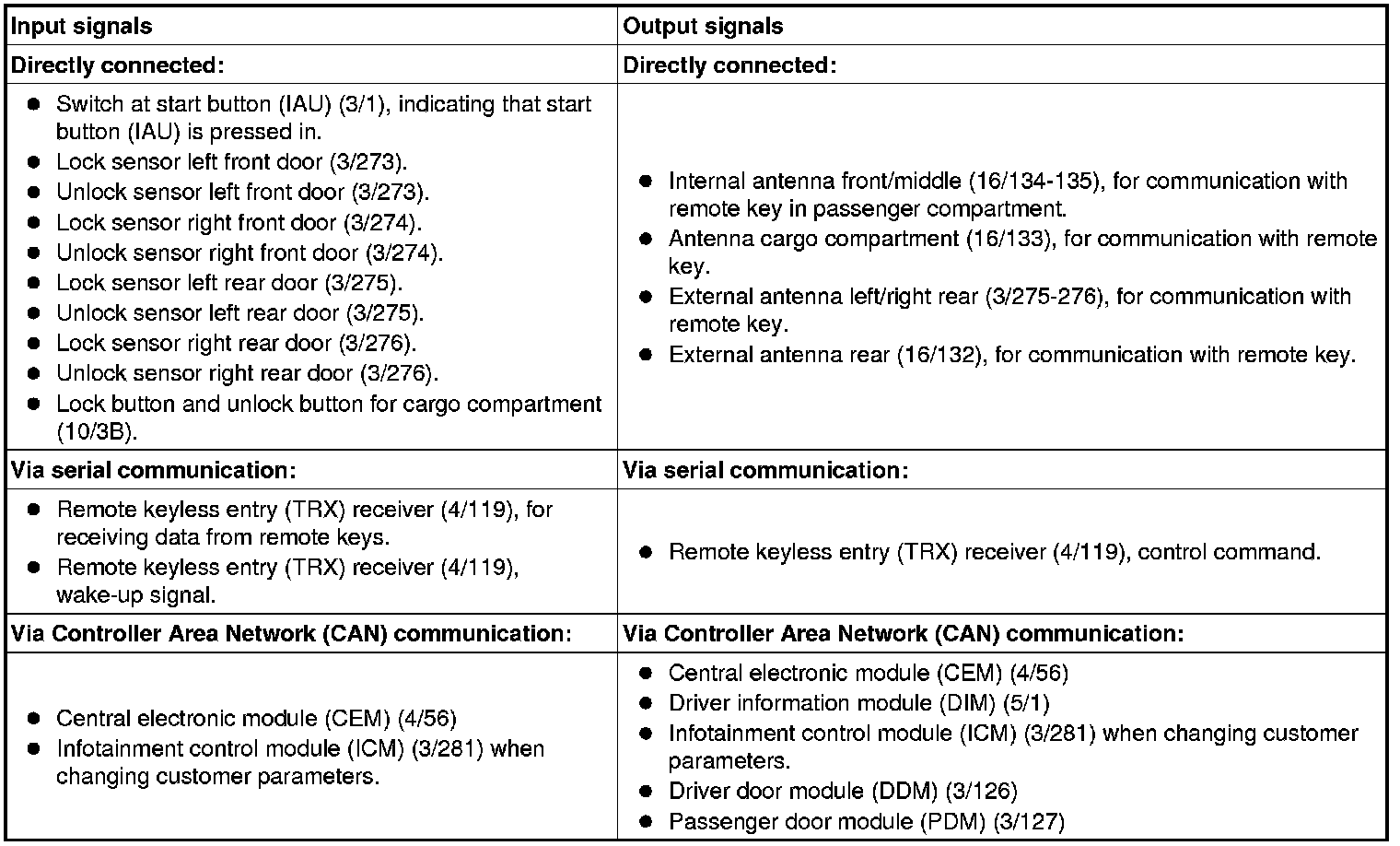The table below summarizes the input signals to and output signals from the keyless vehicle module (KVM). The signal types are divided into directly connected signals, serial communication and controller area network (CAN) communication. The illustration below displays the same information with the Volvo component designations.