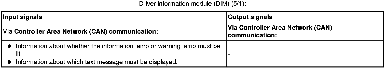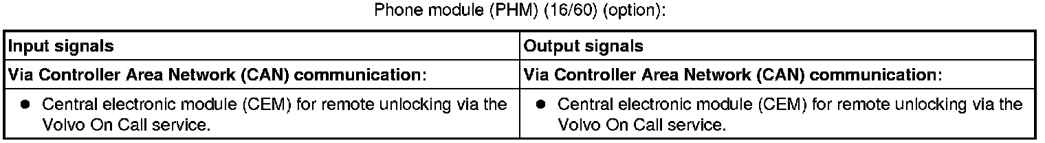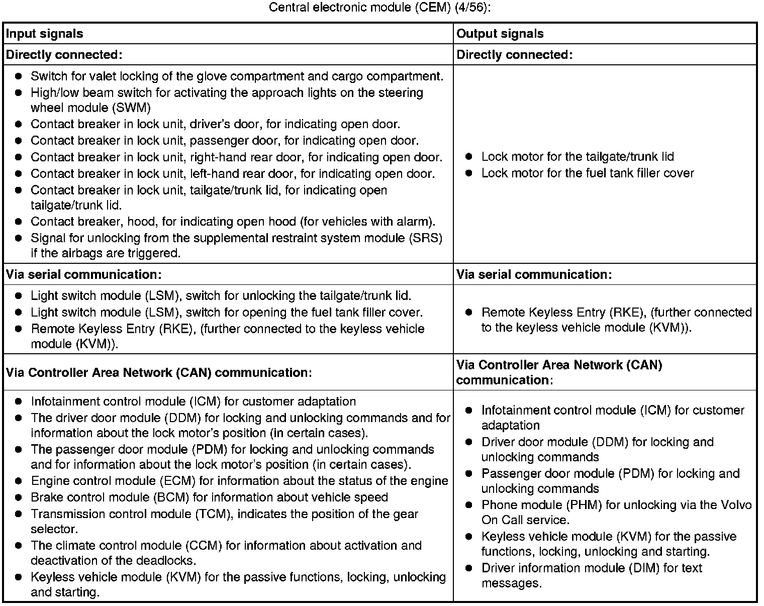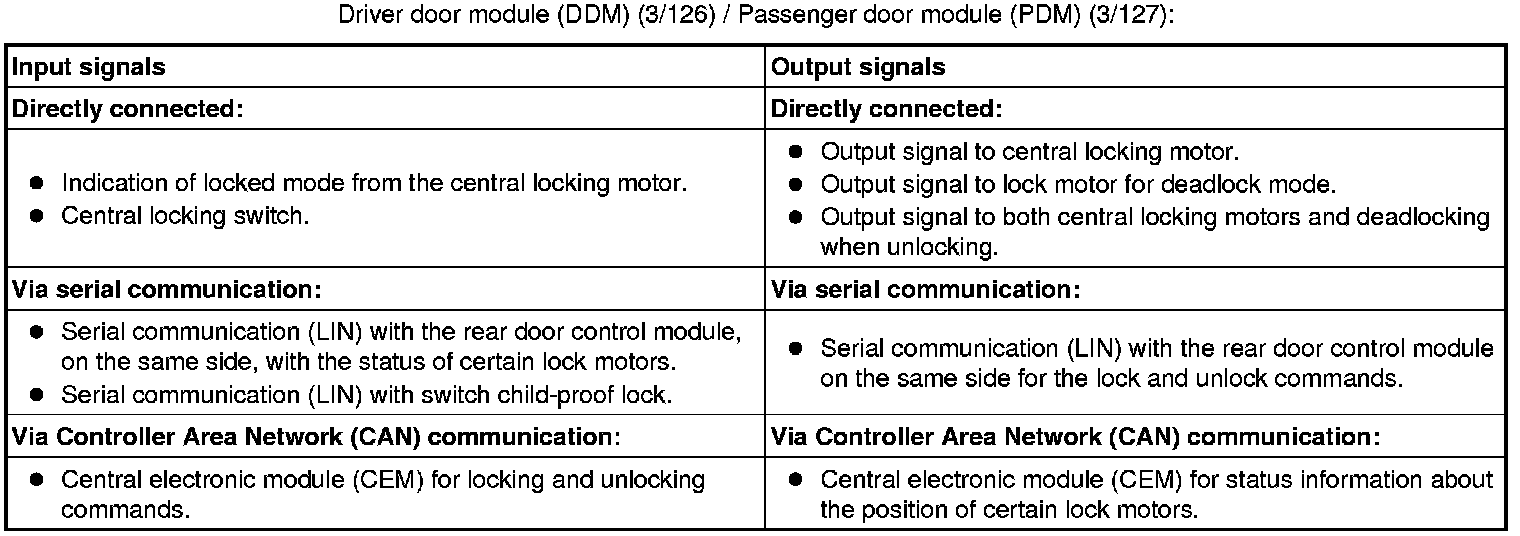 The tables below summarize the input and output signals to the units in the central locking system. The signal types are divided into directly connected signals, serial communication and controller area network (CAN) communication.