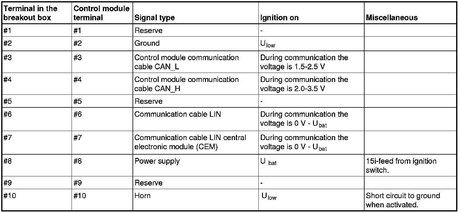 Signal specificationConnector AAll the values given below are between the relevant terminal stated in column 1 and terminal #A2 (ground) unless otherwise stated in parenthesis after the table entry.