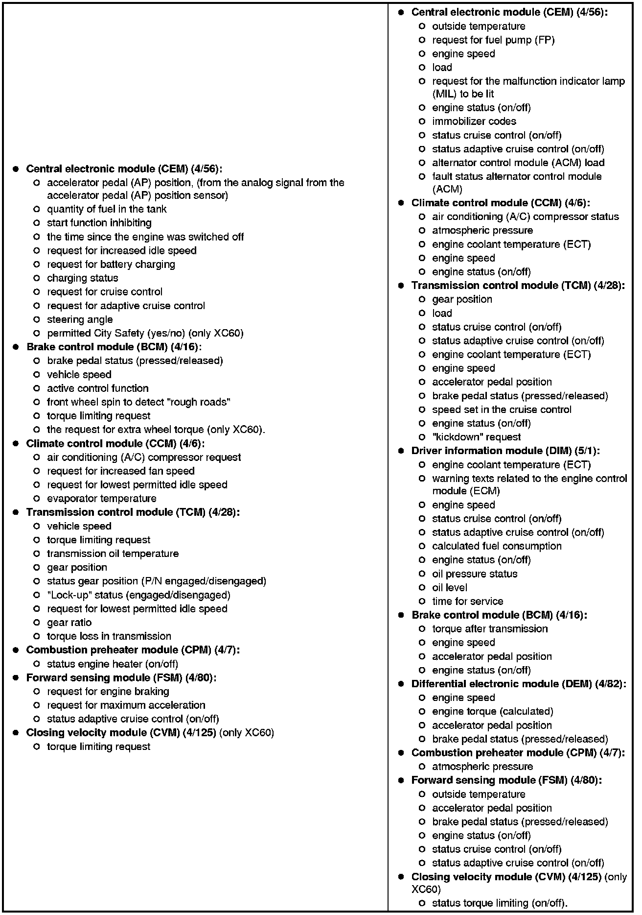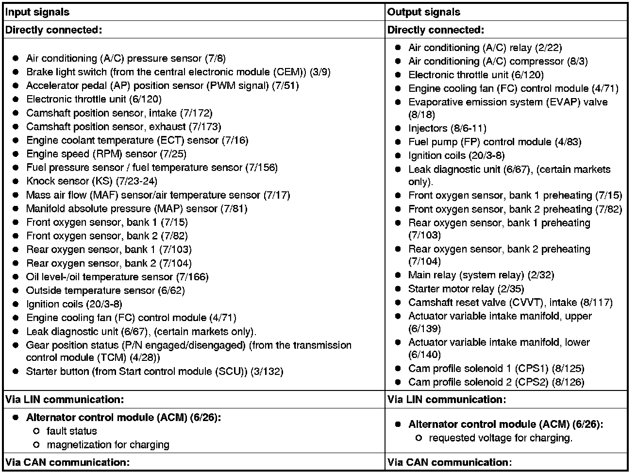 The table below summarizes the input signals to and output signals from the Engine Control Module (ECM). The signal types are divided into directly connected signals, LIN and CAN communication. The illustration below gives the same information as the Volvo component designations.