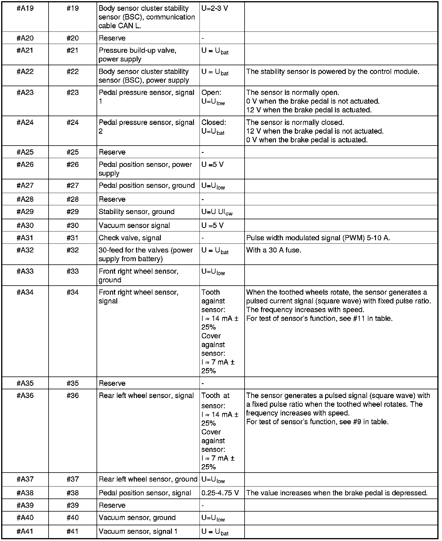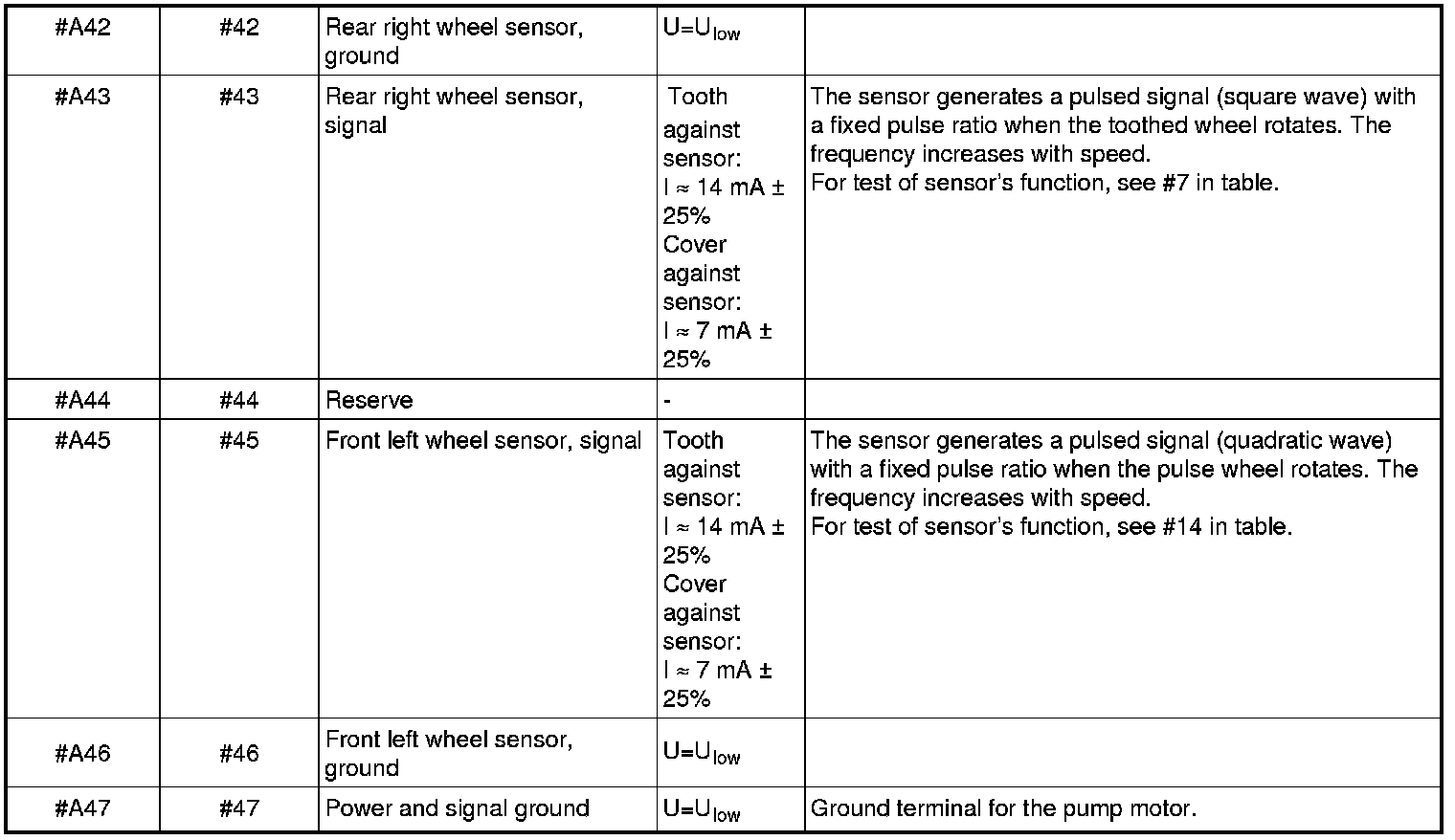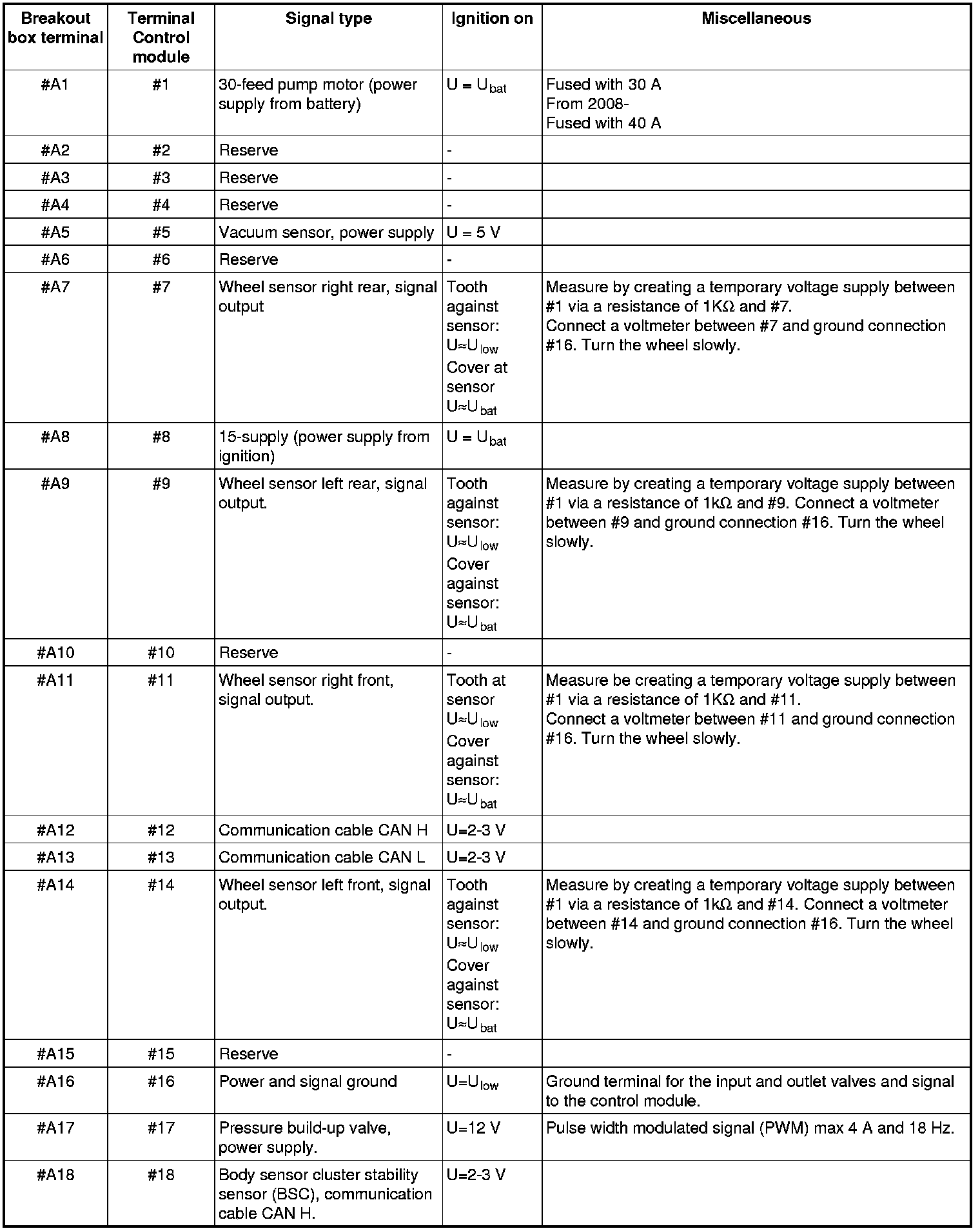 Signal description, brake control module (BCM)All the values given below are between the relevant terminal stated in column 1 and terminal #A16 or #A47 (ground) unless otherwise stated in parenthesis after the table entry.