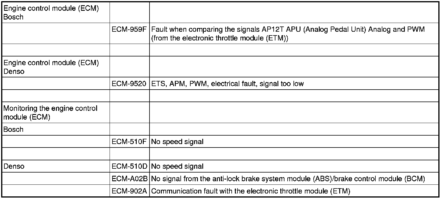 - Discrepancies in the signal from the pedal position sensor between the directly connected signal and the signal over the CAN network. See the table below.